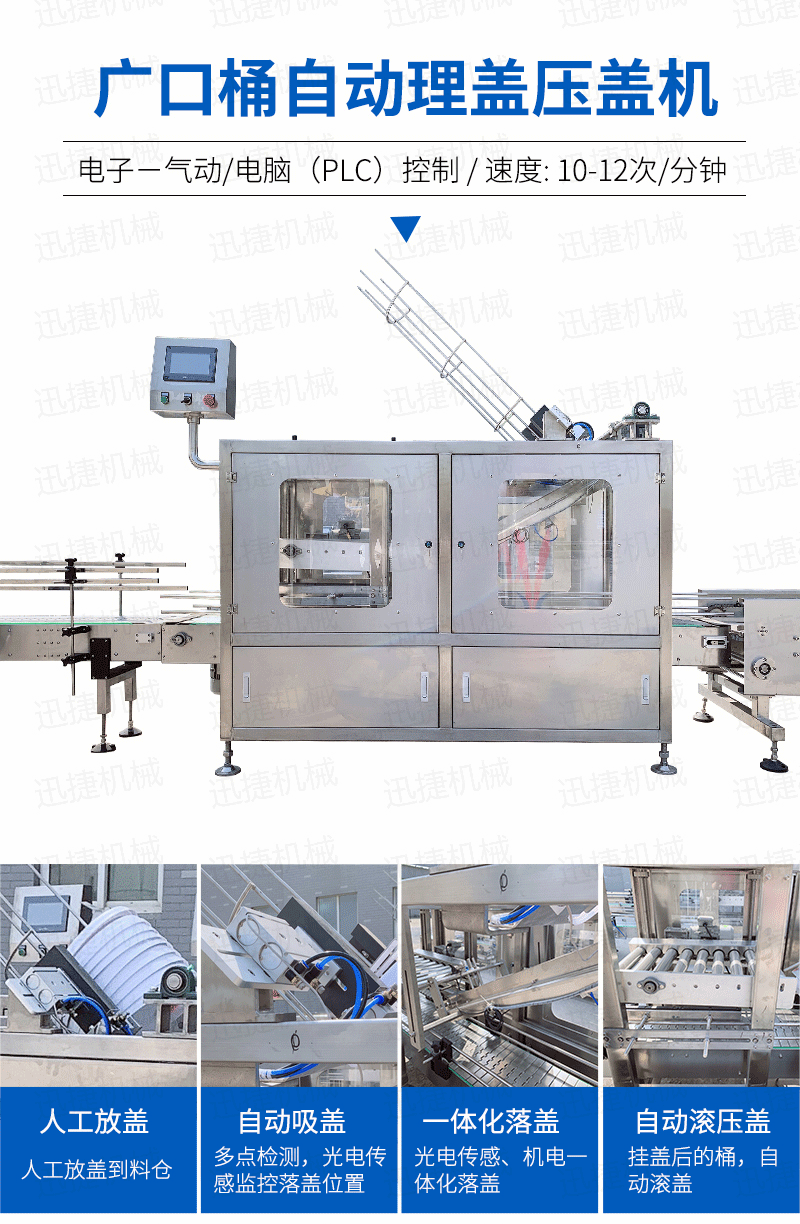 自動理蓋壓蓋機可以完成自動完成理蓋、壓蓋、輸送進瓶、輸送出瓶等一系列操作,設備采用機械式原理,電機驅動,具有工作穩定可靠,操作簡便,生產效率高,適用范圍廣等特點。廣泛應用于各種規則的玻璃、塑料材質的圓瓶、方瓶的壓蓋,是日化、化妝品、醫藥、食品等行業的理想壓蓋設備。